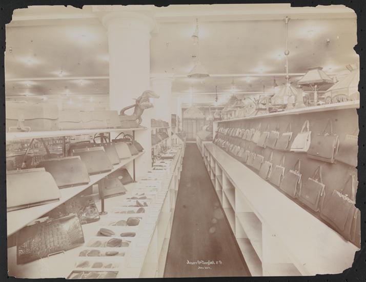 Interior of George Borgfeldt & Co. store; tables displaying purses, lamps and change purses.