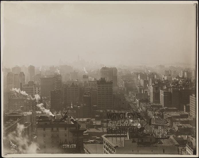 From a midtown rooftop looking south toward lower Manhattan; Wrigley's gum advertisement and the Flatiron Building are visisble.