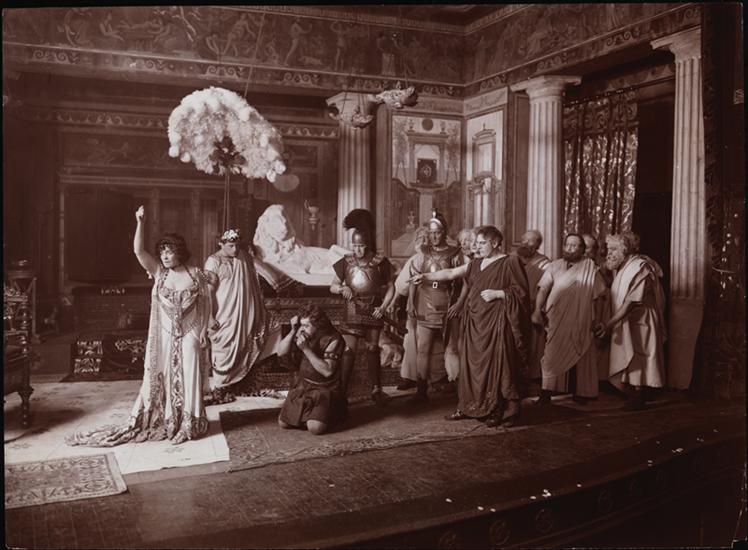 Scene from "Adrea" by David Belasco and John Luther Long featuring Mrs. Leslie Carter as Adrea and Charles A. Stevenson as Kaeso of Noricum, presented at the Belasco Theatre, Broadway and 42nd Street, New York, circa 1905.