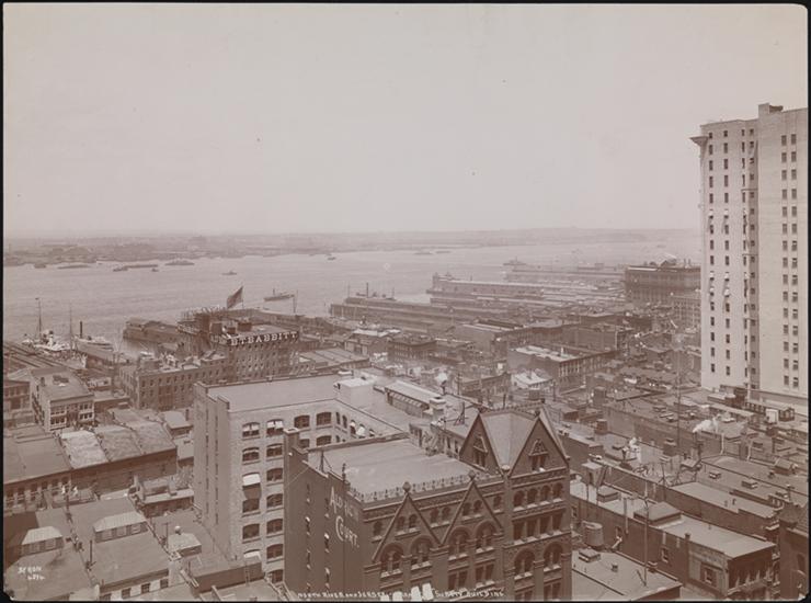 "North River and Jersey from "Surety Building" on neg. | "Looking west from B'way and Exchange Pl." pencilled on verso of duplicate print. | "Hartfield, Solari & Co." stamped on verso.
