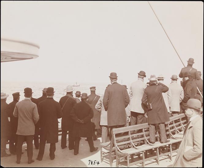 Passengers aboard an excursion boat, watching the International Yacht Race.