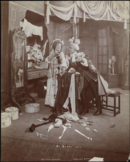 "Mrs. Leslie Carter as Madame du Barry in David Belasco's production of his play "Du Barry," presented at the Balasco Theatre, Braodway and 42nd Street, New York in 1902. Also pictured is Hamilton Revelle as Cosse-Brissac.