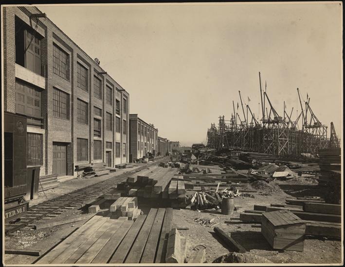 Warehouses, railroad tracks, and shipbuilding scaffolding at the Newburgh Shipyards, Newburgh, N.Y.