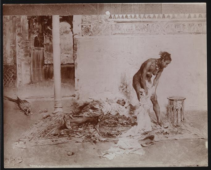 Photograph of a painting of a woman bathing(?) outside; signed by artist, but illegible.