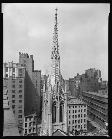 Grace Church, looking north from Wanamaker's, ground to top of tower base of spire to show defective stonework.