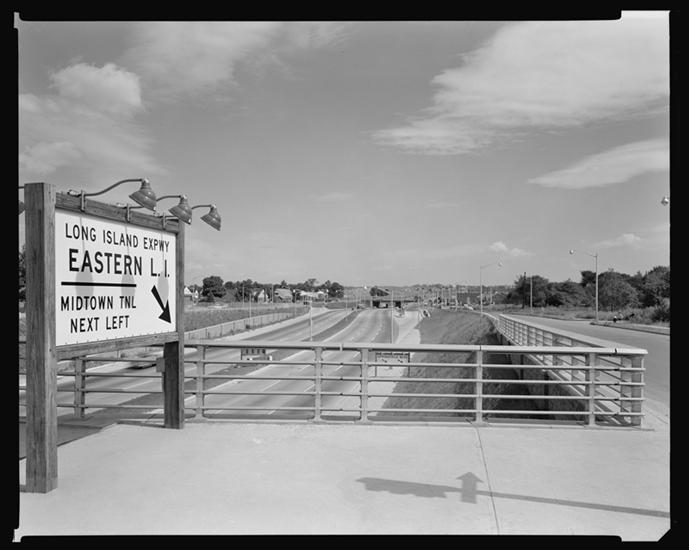 Long Island Expressway and bridges, looking across bridge at Bell Boulevard to north [to show aluminum railings].