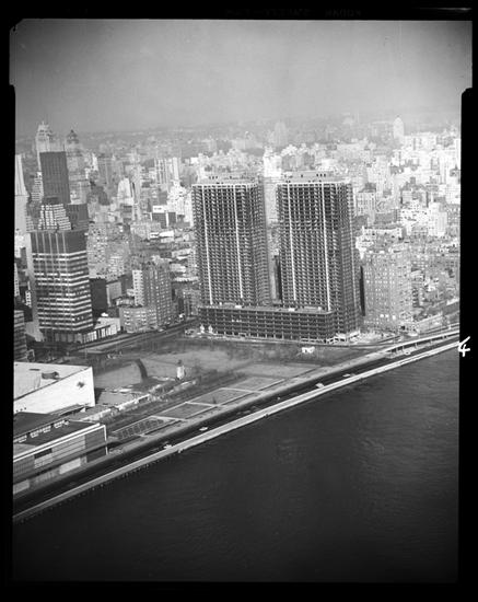 United Nations Plaza Apartments, aerial view looking S.W. from East River near 50th Street.