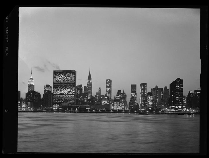 New York City Skyline At Dusk, East River, View From Pepsi-Cola Plant In Long Island City [Showing United Nations.]