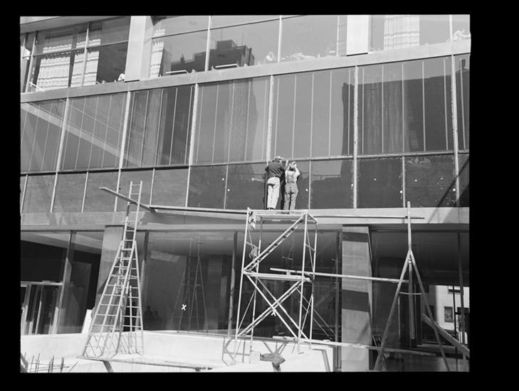 390 Park Avenue. Lever House. Men putting in last pieces of glass in courtyard