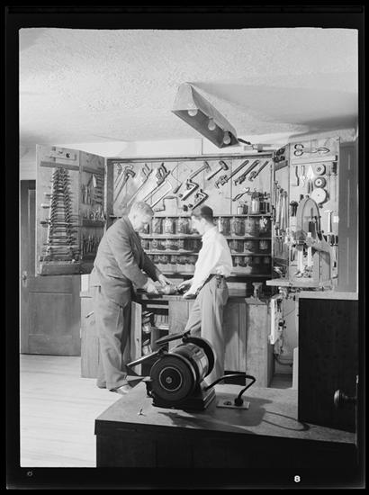 182nd Street and Tyrone Crescent. Basement workshop of Sidney Oshrin, work cabinet with Seymour and Oshrin in front, taken for American Home magazine.