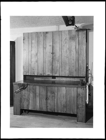 182nd Street and Tyrone Crescent. Basement workshop of Sidney Oshrin, work cabinet.