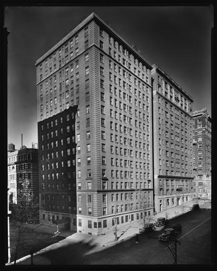 98th Street at the S.E. corner of West End Avenue. Apartment house.