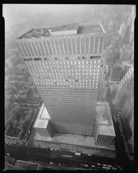 150 East 42nd Street between Lexington and 3rd Avenue. Socony-Mobil Building, bird's eye view from 56th floor of Chrysler Building.