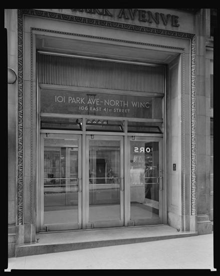 101 Park Avenue. Building, new entrance on East 41st Street, exterior detail of doors.