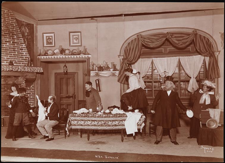 A scene from Weber and Fields' burlesque of Clyde Fitch's translation of Alphonse Daudet's "Sapho" called "Sapolio," a "Clean travesty of 'Sapho'" presented at the Weber and Fields Music Hall in 1900.
