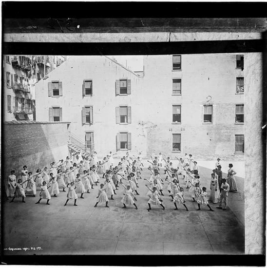 Dumbell excercise in play yard -- public school at Monroe and Market Streets.