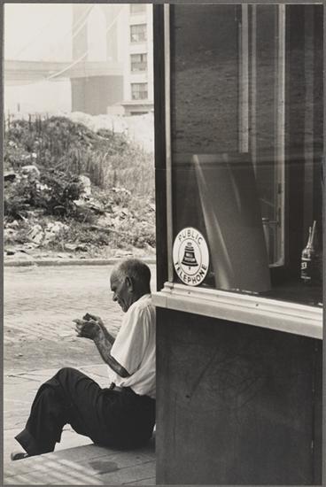 Untitled [Man smoking a cigarette near the entrance to the Brooklyn Bridge.]