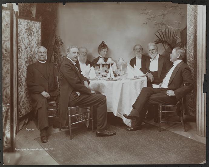 Six men and one women formally dressed, seated at a table at a dinner given to Arnold Bennett, novelist and dramatist, at Harper Brothers.