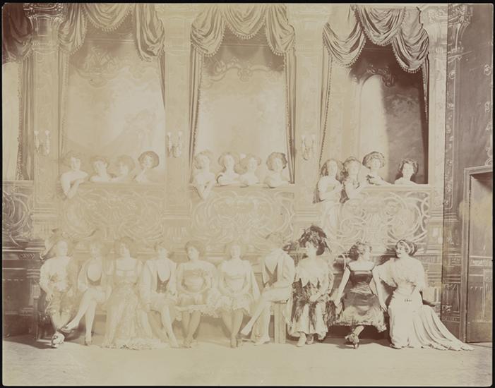 A scene from Weber's Burlesque of the Henry W. Savage production of Lehar's "The Merry Widow" and a production of "The Devil," presented at Webers Theatre in 1909.