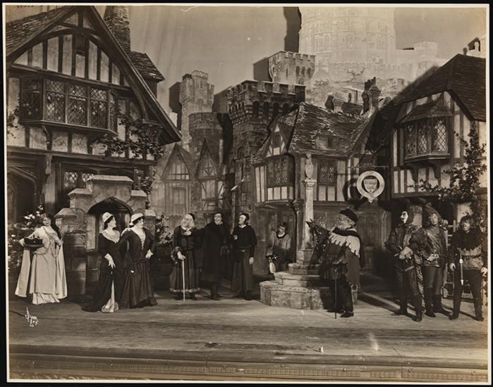 Edith Wynne Matthison as Mistress Ford, Rose Coghlan as Mistress Page, Theodore Roberts as Falstaff and the cast of the New Theatre production of William Shakespeare's "The Merry Wives of Windsor," presented in 1910.