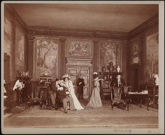 A scene from the New York production of Fabrice Carre and Paul Bilhaud's play "My Daughter-In-Law," featuring the Charles Frohman London Comedians including Herbert Standing, Seymour Hicks, Ferdinand Gottschalk, Fannie Brough, Josephine Gautier, and Ellaline Terriss.