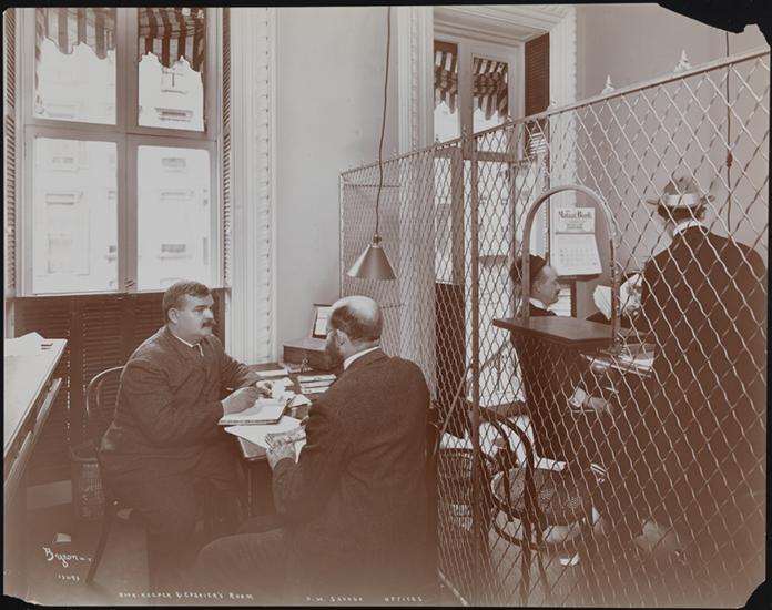 Two men sitting in the caged book-keeper and cashier's room at the offices of theatrical producer H. W. Savage. One man is entering information into a ledger at the desk and the other is holding a bound stack of currency totaling $250.