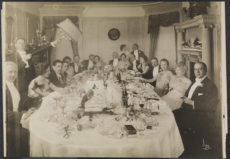 Group portrait of the guests of a dinner for Robert Hilliard, seated at the dinning table. The lamp over the table is being pulled aside by a man standing to the left of the table.
