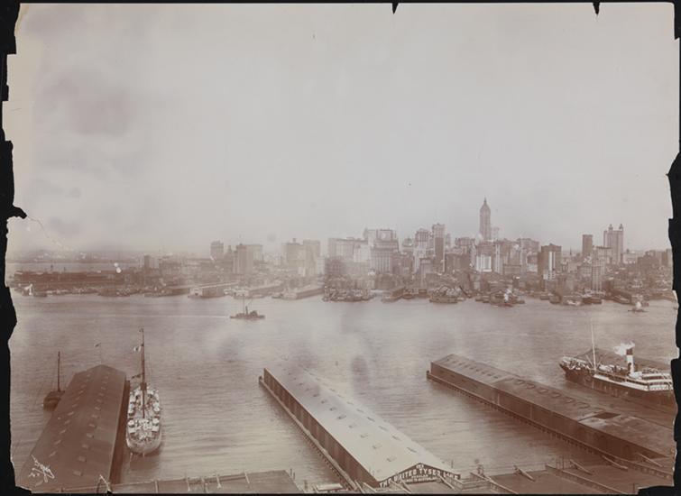 Brooklyn waterfront toward lower Manhattan; Singer Tower visible.