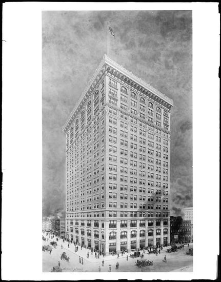 4th Avenue at the S.E. corner of 18th Street. Building, rendering by Hughson Hawley, 1909.