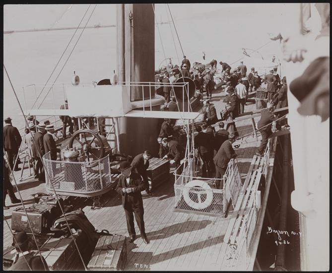 Passengers mill around luggage on a ferry boat adjacent to the S.S. "Deutschland".