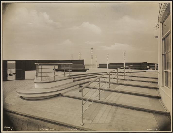 French Line, S.S. "Normandie", Pier #88 N.R., Tourist Class, Deck Promenade.
