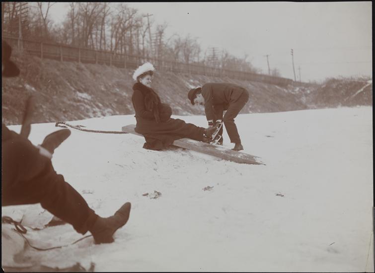 People preparing to ice skate on a frozen lake at McComb's Dam.