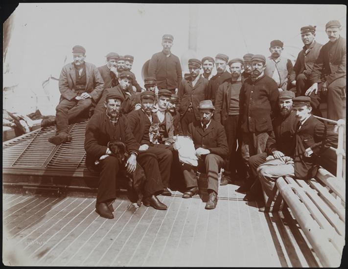 The rescued crew of the schooner "Maldaava" aboard the S.S. "Circassia" after their ship hit an iceberg.
