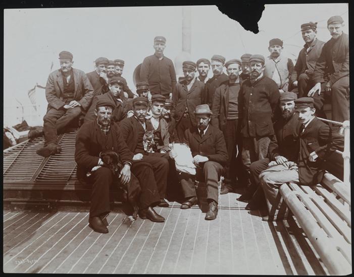 The rescued crew of the schooner "Maldaava" aboard the S.S. "Circassia" after their ship hit an iceberg.