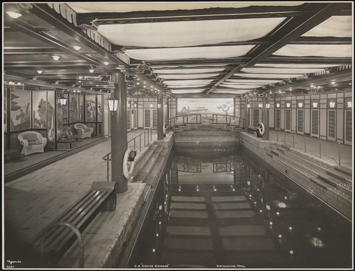 Lloyd Sabaudo Line, S.S. "Conte Grande" Pier 95 North River, First Class, Interior, Swimming Pool.