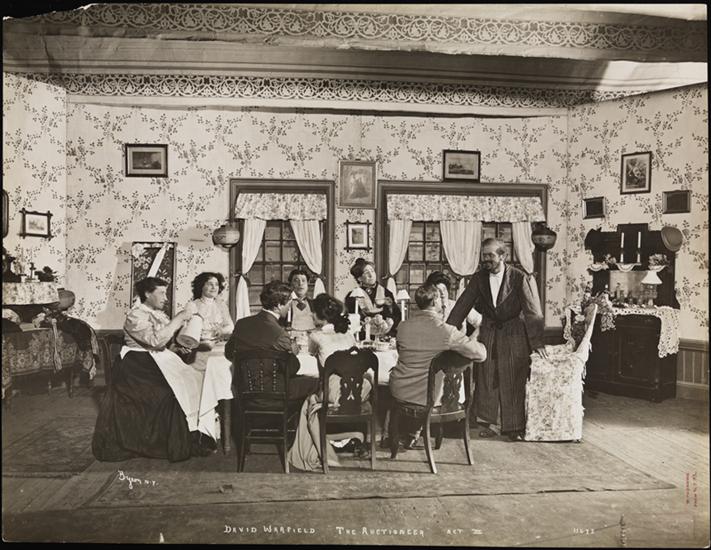 "Act III, sc II" in pencil on verso. | "Withdrawn/from N.Y.P.L." stamped in red ink on recto. | "David Warfield 'The Auctioneer' Act III" on neg.