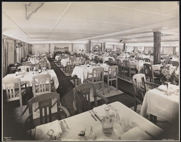 French Line, S.S. "Cuba" Pier 57 North River, Second Class Intermediate, Interior, Dining Room.