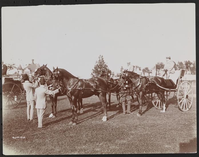 Horse and carriage driven by "Fatty Bates" on the sidelines at the horse show at Monmouth Park, Hollywood, New Jersey.