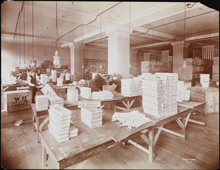 A shipping room at Weingarten Brothers, makers of corsets. Men are at work at tables.