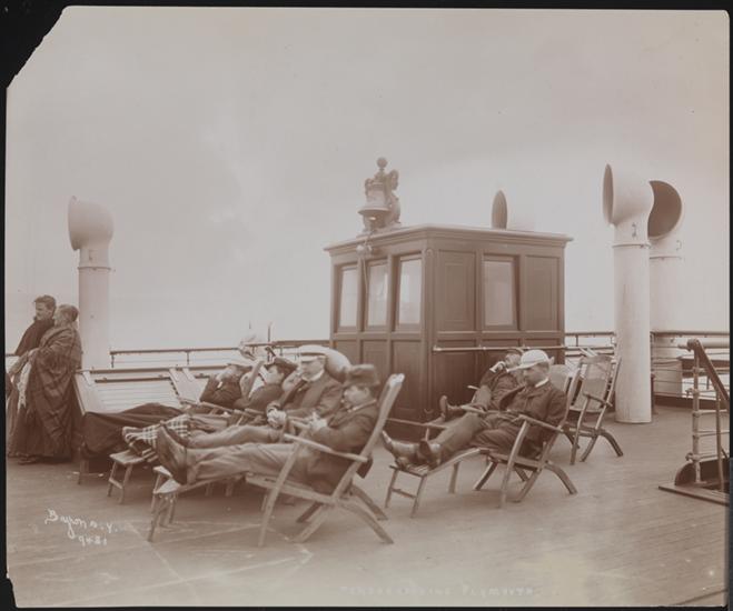 Passengers reclining in deck chairs on the S.S. "Deutschland".