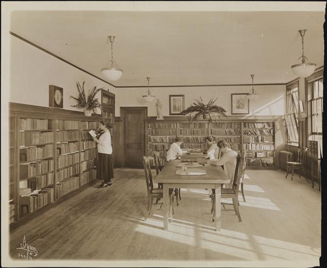 Four young women studying in the library at the Kent Place School for Girls in Summit, New Jersey.