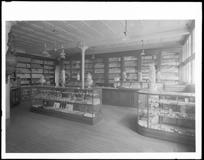 Westchester Avenue at the corner of Simpson Street. Riker's Drug Store interior.