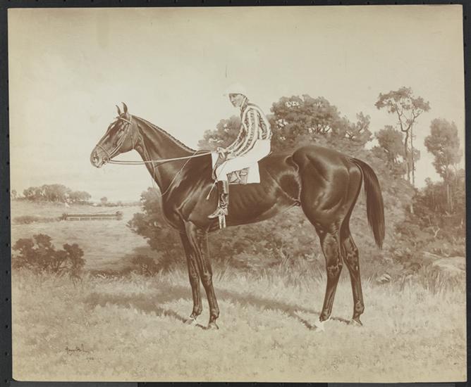 Photograph of a painting of a jockey on a horse; signed Henry Stull, 1904.