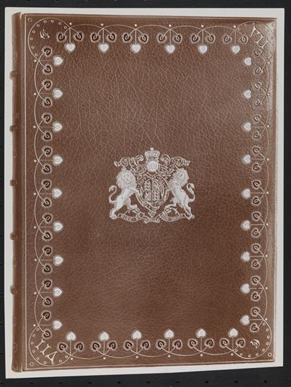 Close-up of a leather book cover with gilt decoration by Walter Dunn, publisher; "Prayer Book of Edward VII, 1903" visible on the spine of this cover in similar print.