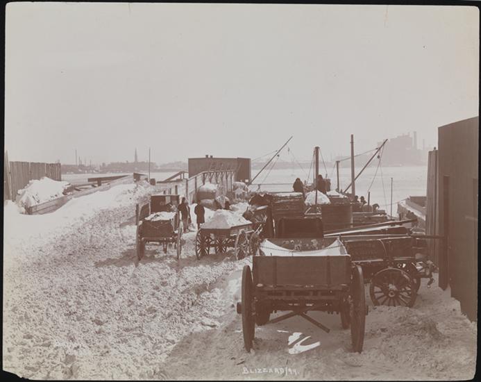 Snow removal workers bringing cart-loads of snow to the East River to be dumped.