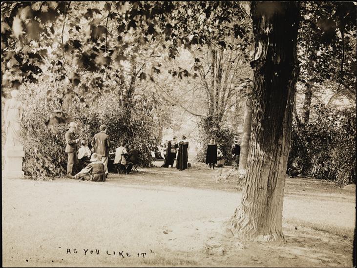 Actors in an open air production of William Shakespeare's "As You Like It" presented on the grounds of what may be the Stevens Residence, Hoboken, N.J.