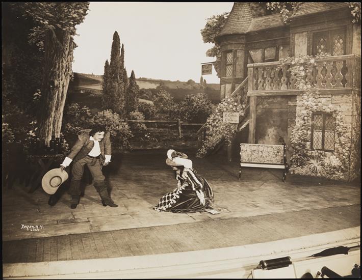 A scene from Sydney Grundy's play "The Musketeers" featuring James O'Neill as D'Artagnan, presented at the Broadway Theatre in 1899.