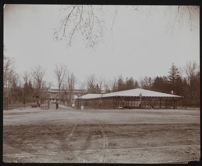 Men working on a covered pavillion at Belmont Park Race Track, Elmont N.Y.