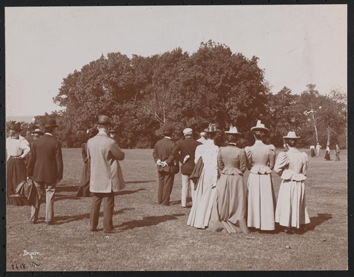 Description Men and women watching golfers at the Ardsley Golf Club.