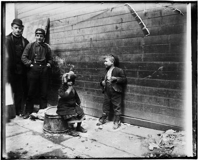 Two Greek children in Gotham Court debating if Santa Claus will get to their alley or not. He did.